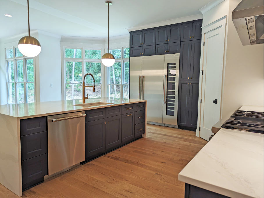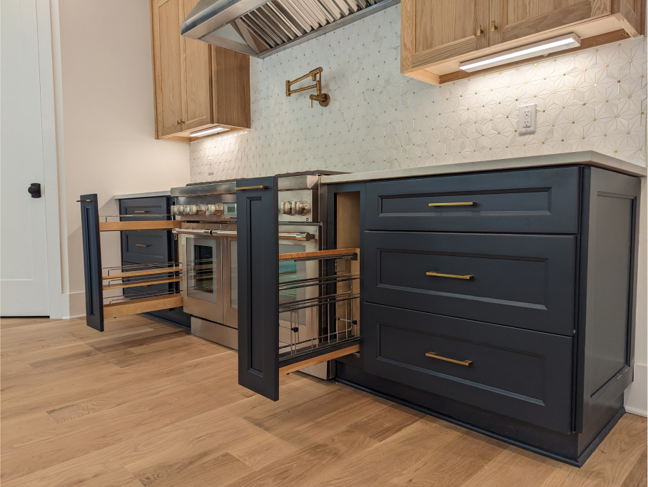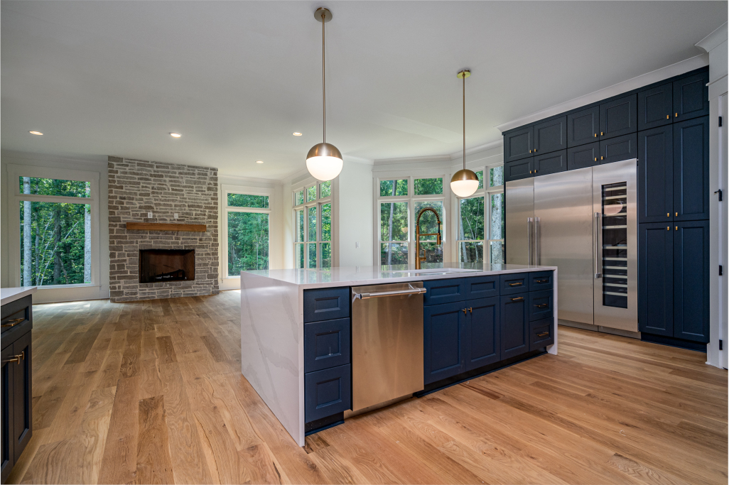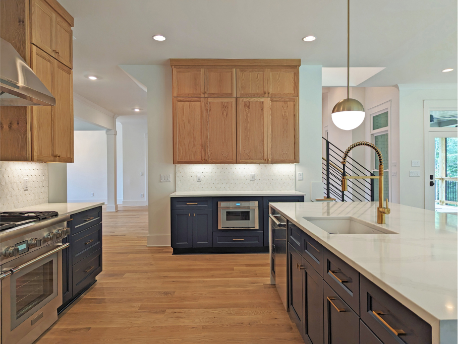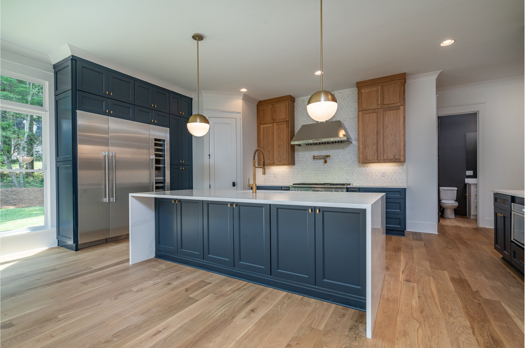 The kitchen is a chef’s dream with high-end Thermador appliances including a 48” range with double oven and built in frig & freezer with a wine tower. The homeowners chose custom white oak cabinets above and beautiful navy-blue lower cabinets, all accentuated with a modern tile back splash, gold hardware, motionsense wave facet, pot filler, and sleek lighting. The generous island features a quartz waterfall and backside cabinets for extra storage. The large walk-in pantry adds to the luxury & functionality of this brilliant kitchen.