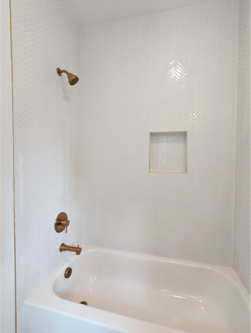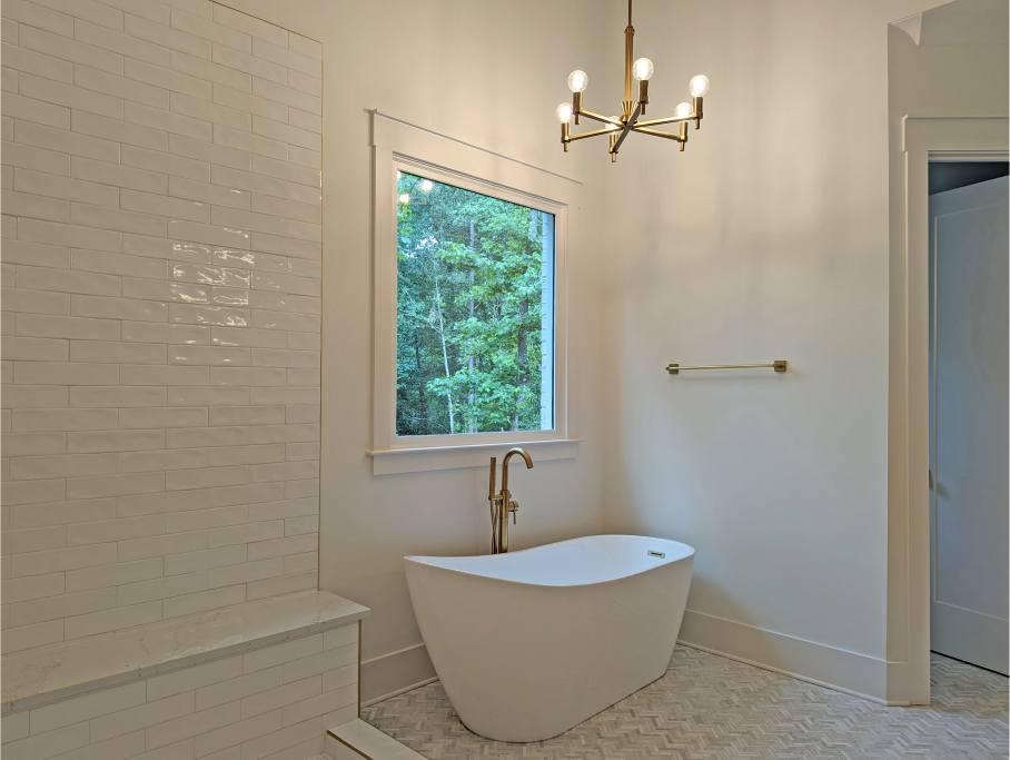 Also, on the main level of this 7,000 sq ft home is the owner’s suite which features an incredible multi-layer tray ceiling, huge walk-in closet, and an en–suite bathroom that is the epitome of sophistication. With slim French pinback doors, double white oak vanity, large free-standing tub, separate water closet, gorgeous white tiled shower with gold trim, light gray herringbone floor tile, and a gold chandelier, this bathroom is the space where you begin your day feeling like a million bucks.