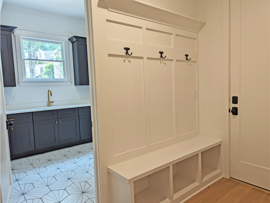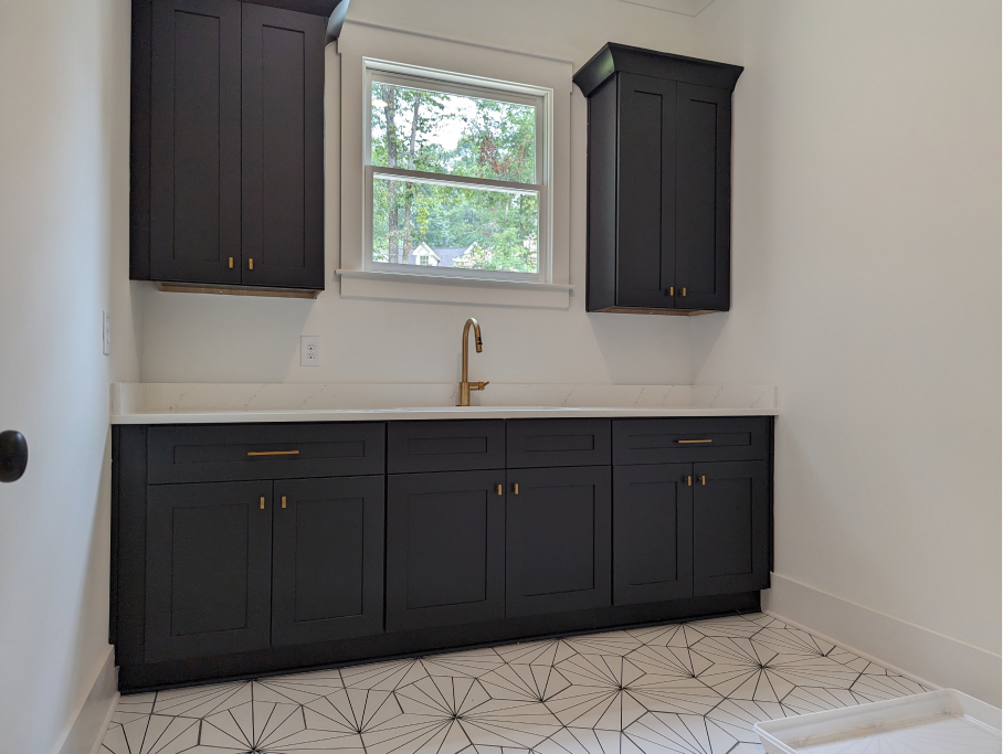 On the right side of the home is a 3-car garage, mud room/drop zone, half bath, and a full laundry room with modern floor tile, cabinetry, sink and natural light.
