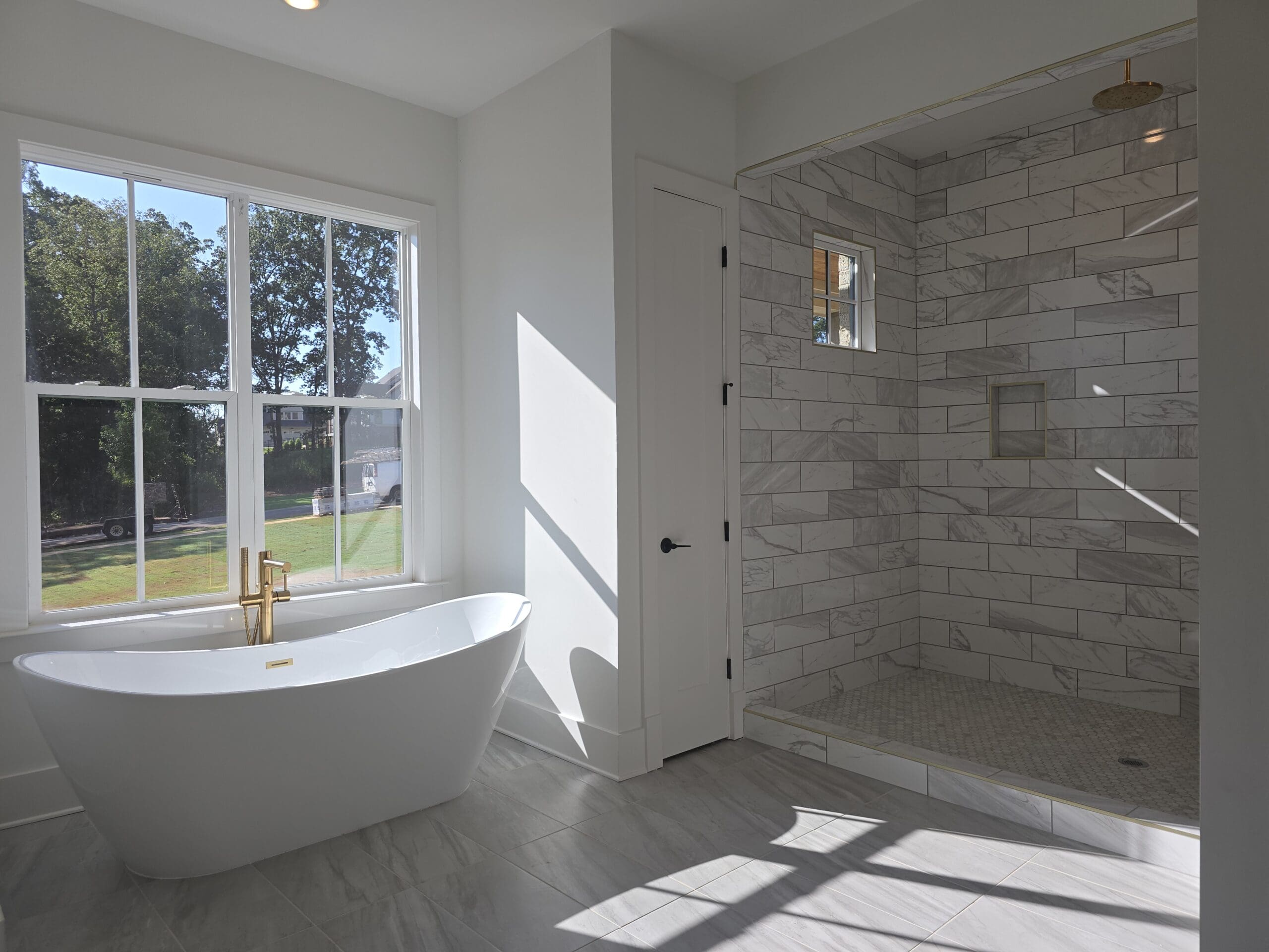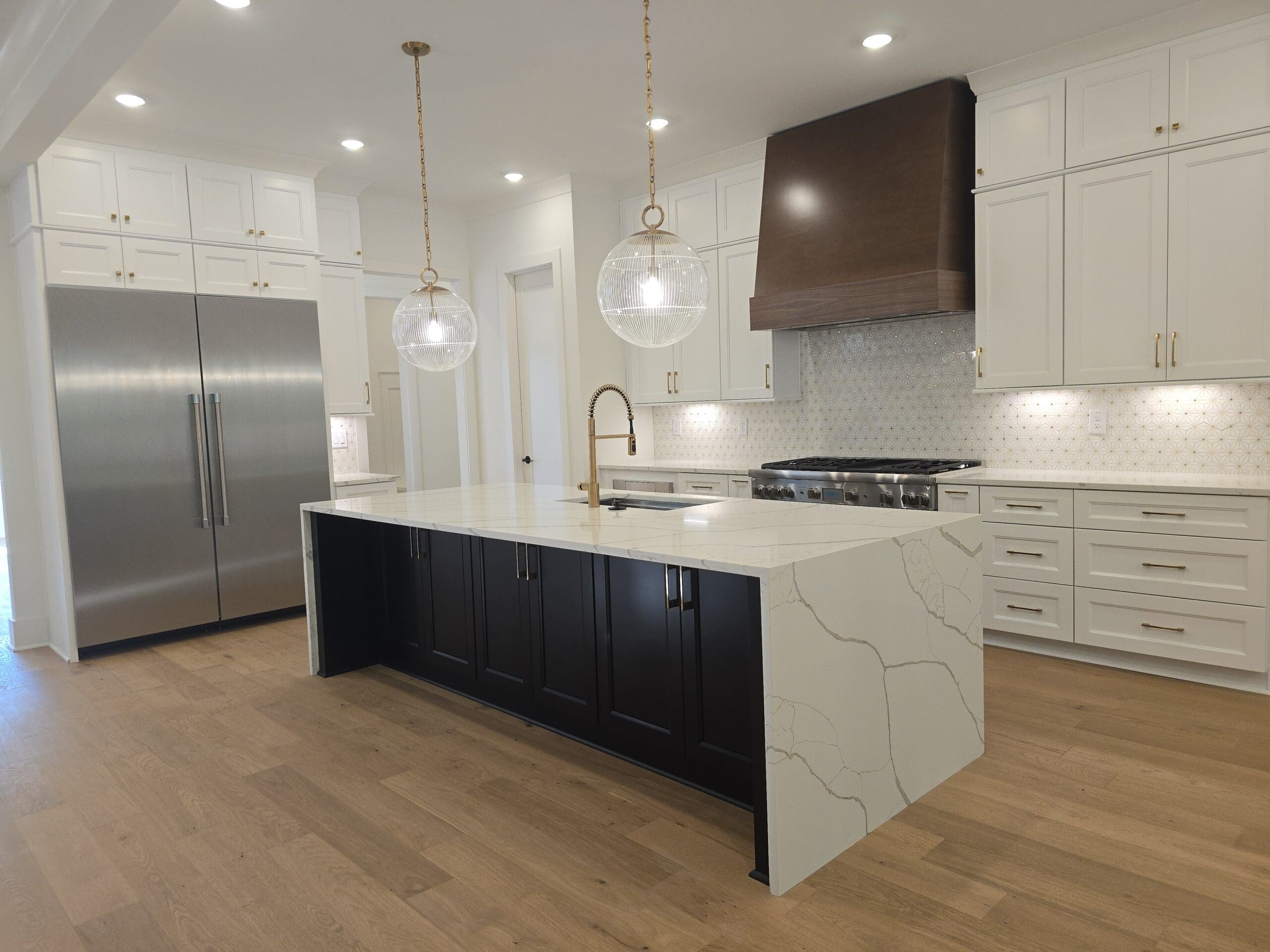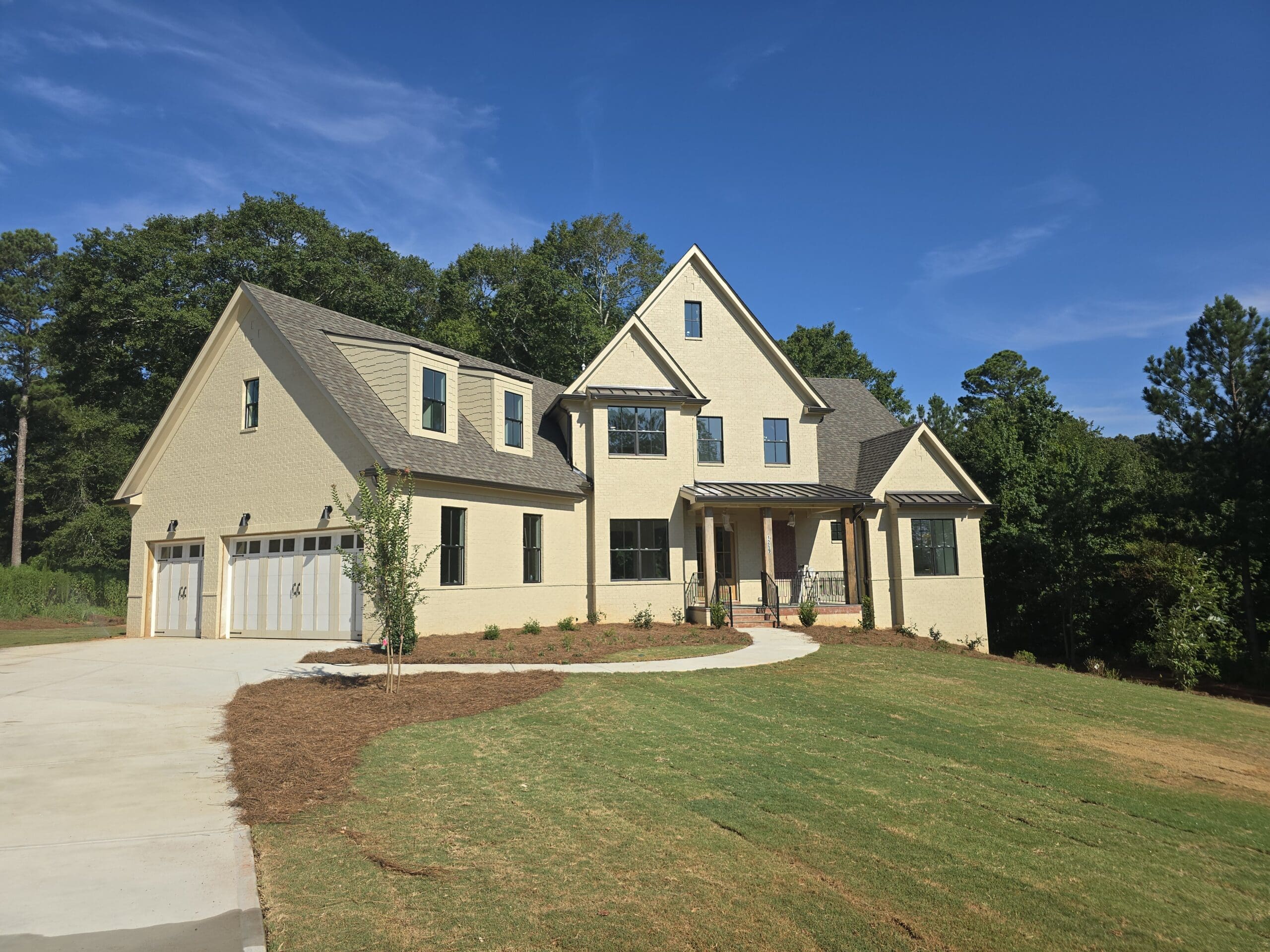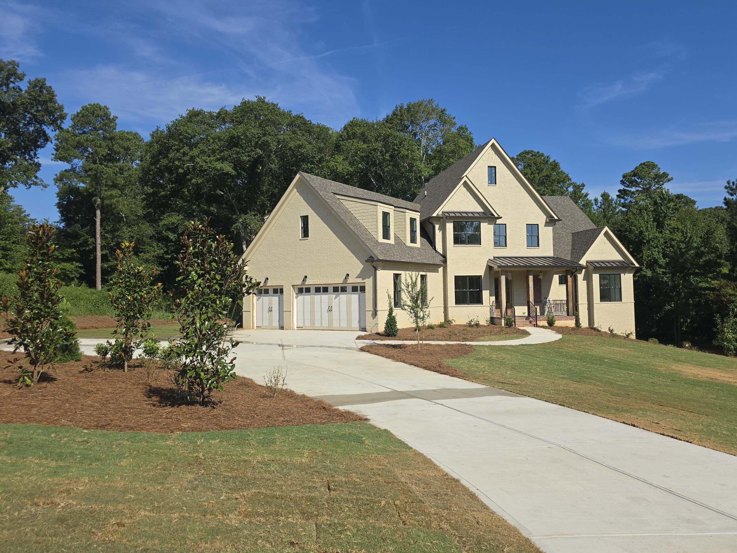 The 2nd home we completed in Spartan Manor is a new twist on a previous build, and the results are exceptional. This beautiful 4,206 square foot painted brick home sits on a 1.51-acre lot and is designed to impress, blending the latest design trends with thoughtful, luxurious finishes. A grand foyer leads into a spacious living room with a 10’ coffered ceiling, built in bookcases, and a high-end, modern cast stone fireplace. The large open layout of the kitchen and breakfast nook captivates and comforts with luxury and light. Whether an avid entertainer or home cooking enthusiast, this kitchen provides the perfect workspace featuring Thermador stainless steel appliances, including a 48” gas range, side-by-sde 30” refrigerator & 30” freezer, dishwasher, microdrawer, a huge walk-in pantry, a 9-foot island with outside cabinets, large sink & touchless faucet. Speaking of cabinets, narrow spice and pan pullout cabinets are provided on either side of the oven for extra convenience. This kitchen is a joy with plenty of natural light, modern pendants, can lighting, and under cabinet lighting. Large glass sliding doors provide easy access to the private covered back deck. The separate dining room is the prefect pl place for special mealtime gatherings. Continuing on the main floor, the primary suite is a luxurious retreat featuring the ideal amount of natural light and custom closets.  Get ready to conquer the day or enjoy downtime as you step into a huge 5’ x 10’ x 10’ beautifully tiled shower with gold double shower head and handheld system, relax in the 72” modern freestanding soaking tub, and look your best at the spacious double vanity. On the opposite side of the main floor comes an additional office or guest room with access to a full bath, complete with tiled shower. Entering through the 3-car garage and just off the kitchen an extra large mud room and separate spacious laundry room provide conveniences for daily living.